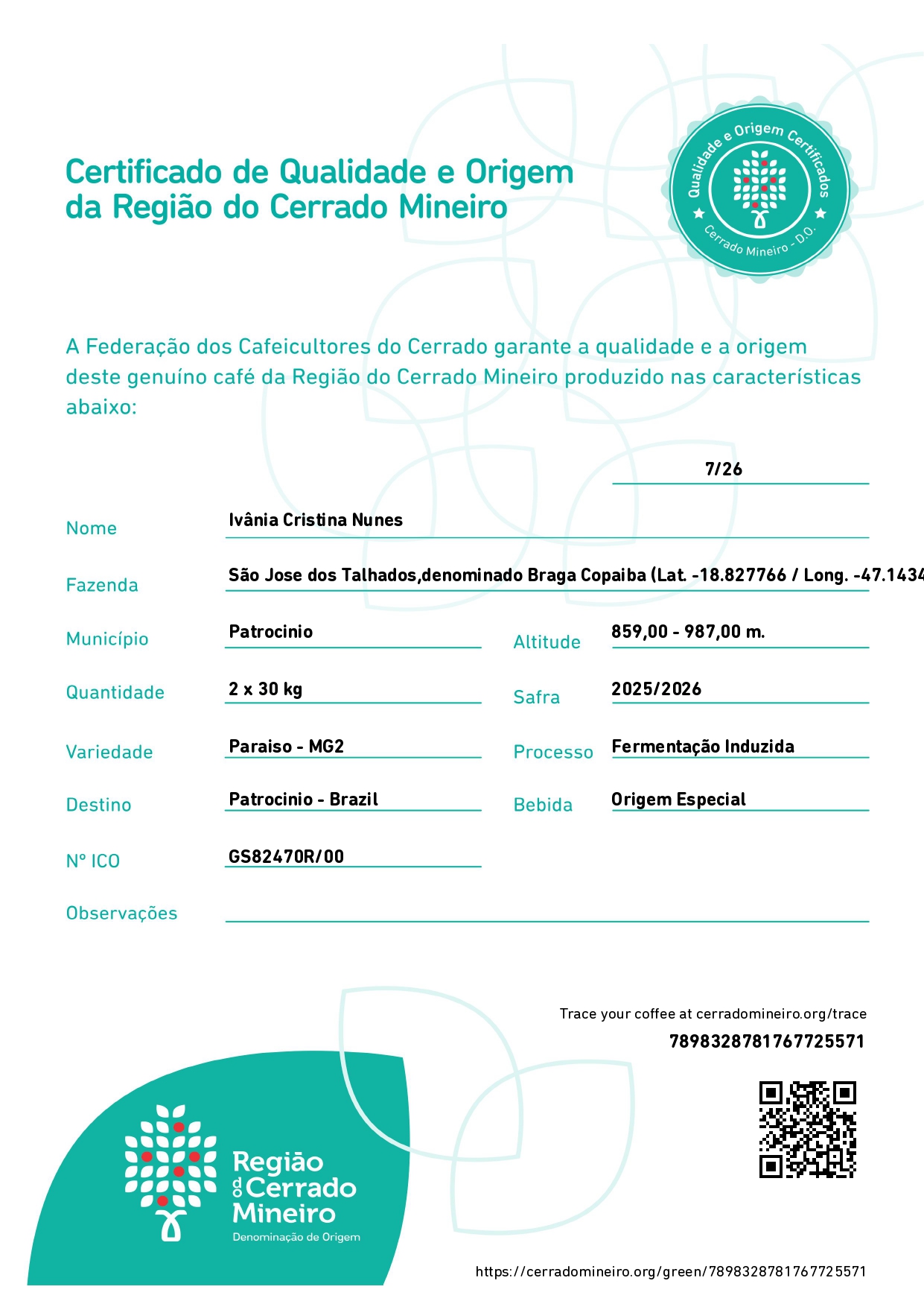 Café especial certificado da Região do Cerrado Mineiro, produzido na Fazenda Espigão do Palmital em Campos Altos. Lote da variedade Catucaí Amarelo 2SL, com fermentação induzida e bebida de origem especial, rastreável e certificado pela safra 2025/2026.